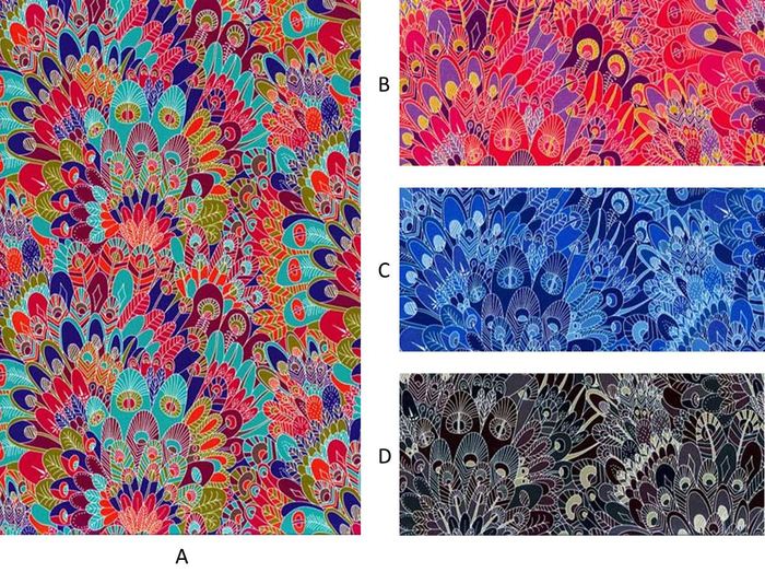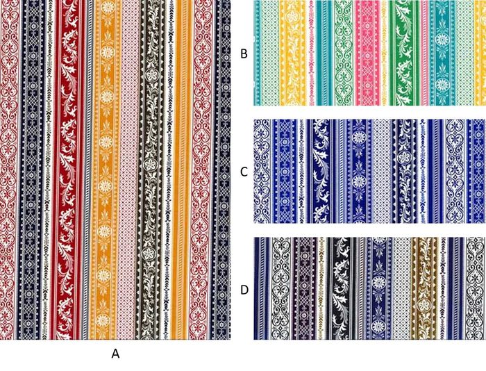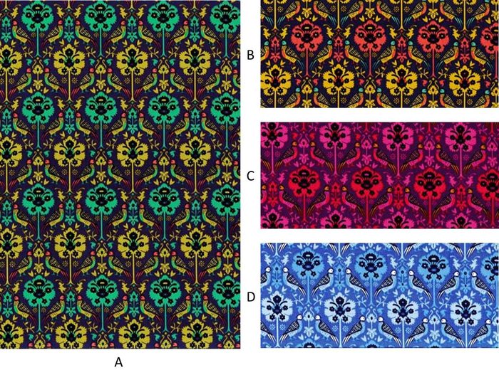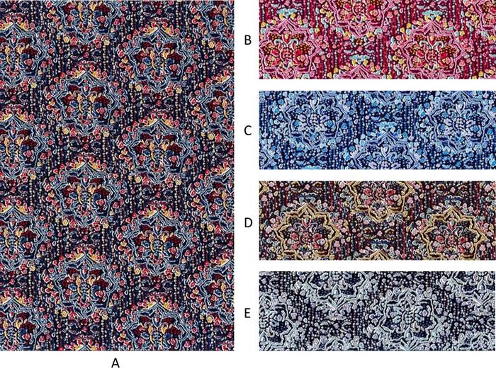 1459年から1461年にかけ描かれた有名なイタリアのフレスコ画「メイガス・バルタザールの行進」の中で描かれている人物の衣装からヒントを得ています。この絵はフィレンツェのパラッツィオ・メディチに飾られています。この柄は、フレスコ画の中の一人の男性が着ているローブからとったもので、フェルト・ペンとグワッシュを使って制作されました。