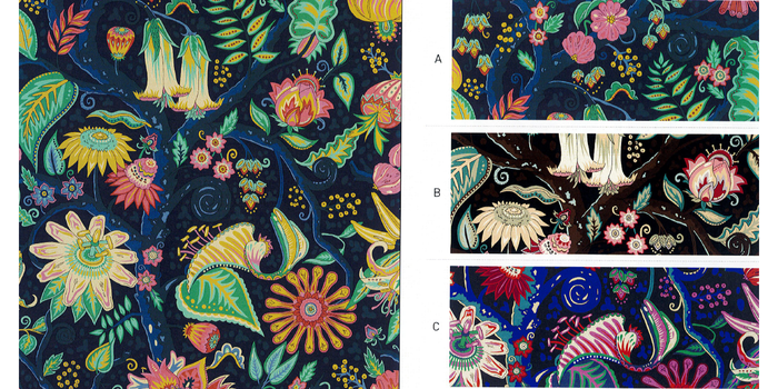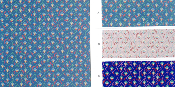 西洋人が思い描く、東洋の楽園にある植物を色鮮やかに描いています。これらの入り組んだデザインは、細線でフルーツ、ベリー、そして葉っぱなど、珍しい植物のディテールを捉えています。