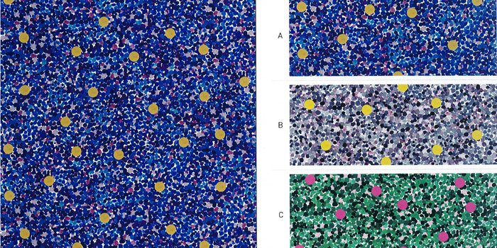 砂漠の砂の粒子をモダンな水玉模様と合わせ、斑点が折り重なったデザインです。