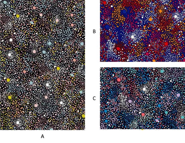 天空に広がる水玉模様(ポルカ・ドット)の世界です。キャンバスにとらえられた水玉のエネルギーや動き、瞬く星座たちが広い夜空を映し出します。