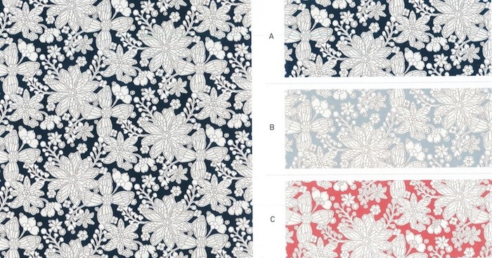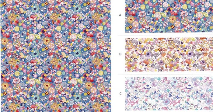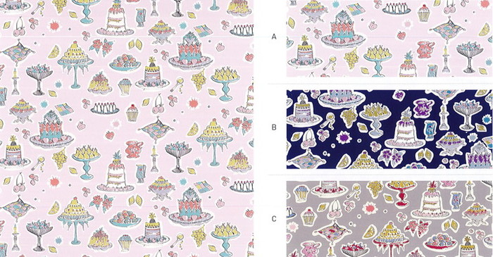 ずらりと並んだハイ・ティ(アフタヌーン・ティ)のご馳走をユーモラスに描いた柄です。癖のある味の果物や、美味しそうなカップケーキやパイナップルケーキを積み上げた大皿が一面に描かれています。羽根ペンとインクで描かれ、パントン・ペンで色付けされたこの柄は、子どもの頃のパーティの無邪気な感性が現れています。