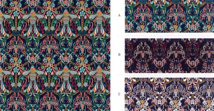 アール・ヌーボースタイルで巣に宿る女王蜂を描いたこのデザインは、1900年代の繊細なジュエリーの柄をヒントにしています。重厚なバックに対比させたポップな色が豪華な宝石のようです。