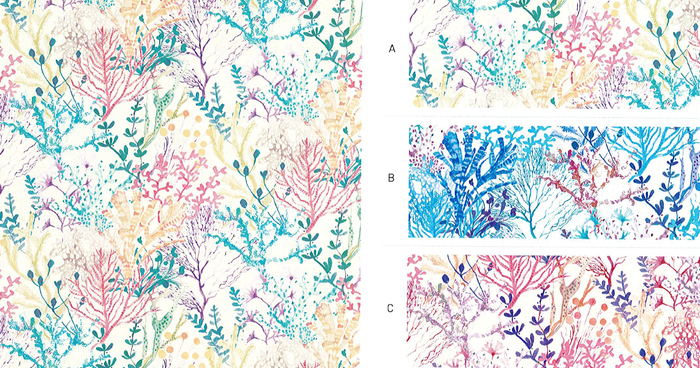 水面下に広がる世界の繊細な美しさをとらえたデザインです。水中で揺らぐ珊瑚が、水彩タッチでディテールまで丹念に描かれ、心和む水中の世界に誘います。