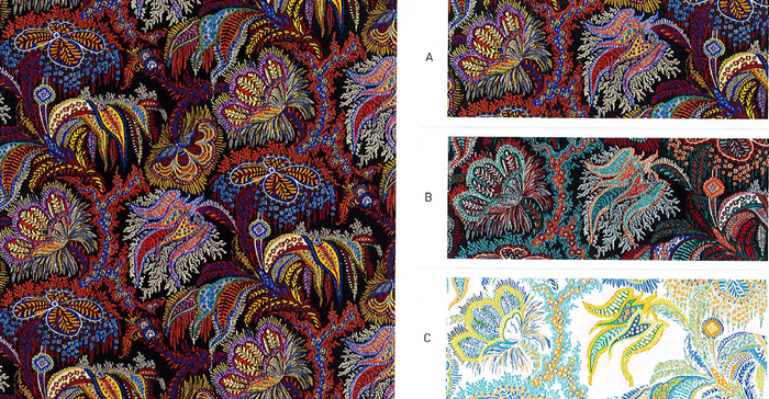 1968年にリバティのマートン工場で作られ、『カンダハル』(後に『ブルサ』)と呼ばれていたペイズリーの花柄からインスパイアされたデザインです。オリエンタル調の大振りなペイズリーの葉を小さな花々が繋いでいます。70年代後半に復刻されたデザインは、78年秋冬のインテリアコレクションに用いられました。