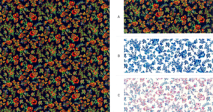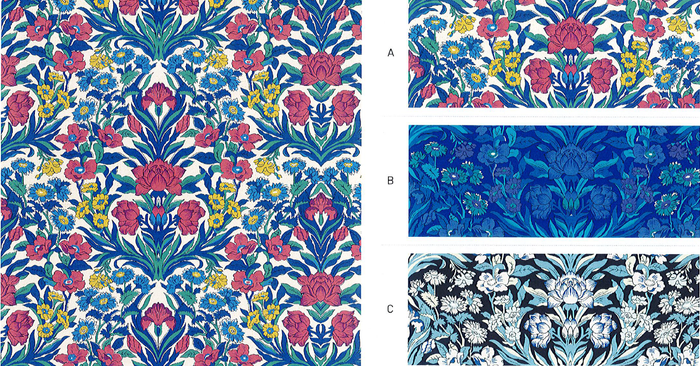 かつては『ヘンリエッタ』と呼ばれていた典型的なアーツ&クラフツ・スタイルの柄で、マーガレット、ナデシコ、ユリ、スイセンなどいろいろな花を組み合わせたデザインです。中でも最も古いものは1890年代のリバティ アーカイブのシルク帳に保管されています。