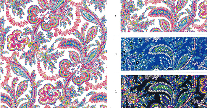 海藻や珊瑚が連なるように配置され、ペイズリーのリーフ模様を作り出します。もともとは1970年代にメンズウェア向けにダークな色彩でウール地にプリントされていた『バルナバス』という名のデザインでした。