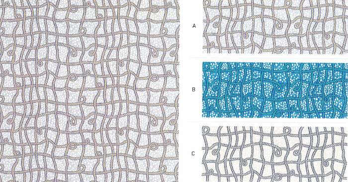 ツイストさせたロープが作り出す遊び心のある格子と、背景に浮かぶバブルとが、楽しくキッチュな無人島での暮らしを応援します。
