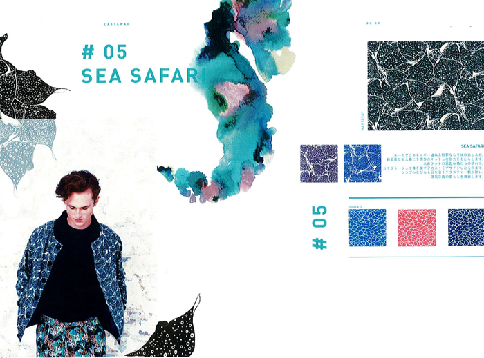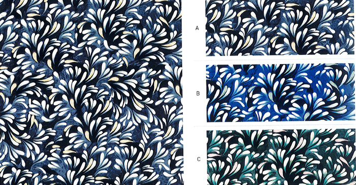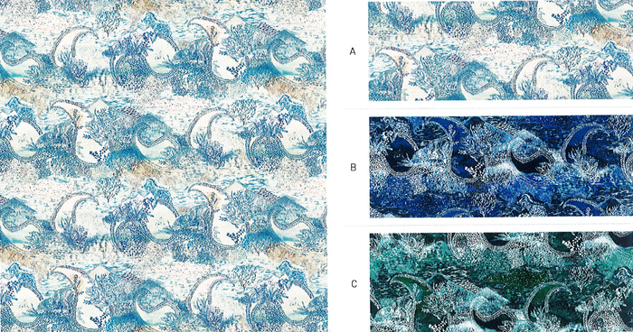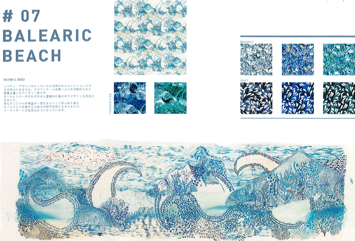 まさにリバティのデザインスタジオを象徴するもので、リバティのデザインチームのメンバー全員がそれぞれに人里離れた島で隔離された状態で制作して完成されたデザインです。全長8mにも及ぶ長さのキャンバスを使い、変化する海中、山や森を自由なタッチで描いた柄です。