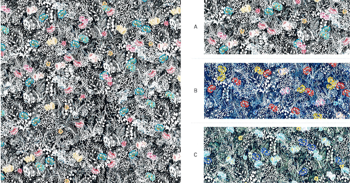 際立つ鮮やかな花の色が、プリント全体に新たな奥行きを与えています。