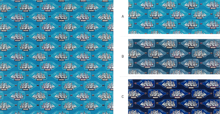 もともとメンズウェアのために、60年代のアーカイブ柄を参考にしてデザインされたもので、ボトルシップを格子状にアレンジした小さなカンバセーショナル柄です。