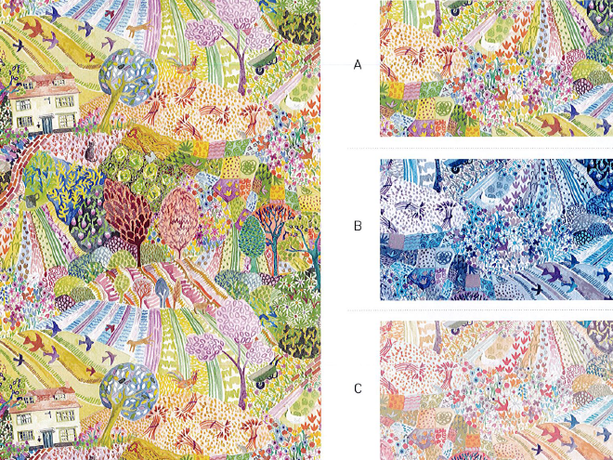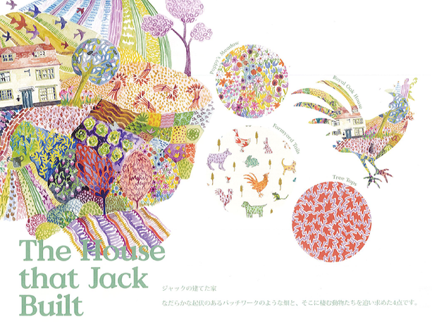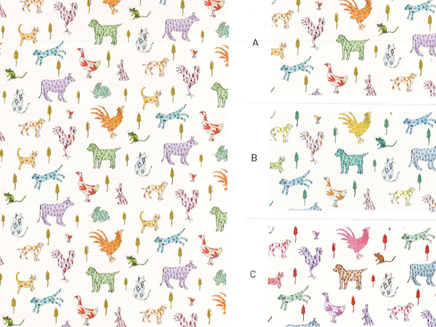 豊富な色と模様が入った一枚の絵のようなデザインで、童謡からとった小さな動物たちが隠されています。