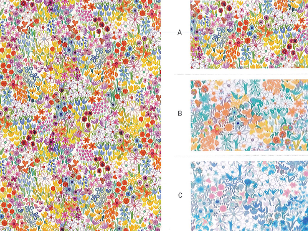 一面に散らした可憐な小花が水彩で描かれ、ソフトでまるで夢のような雰囲気をもっています。
