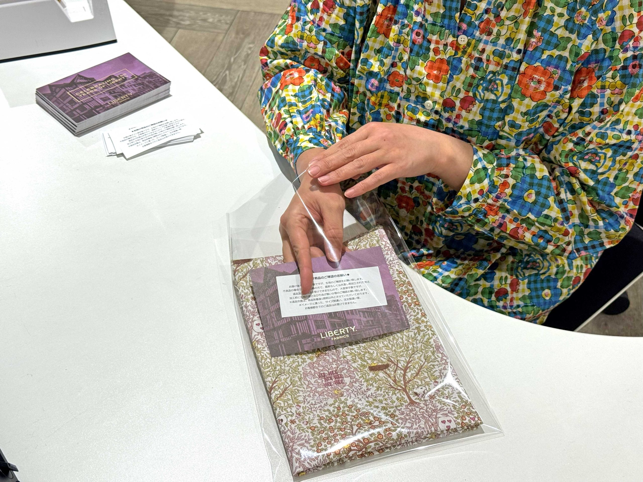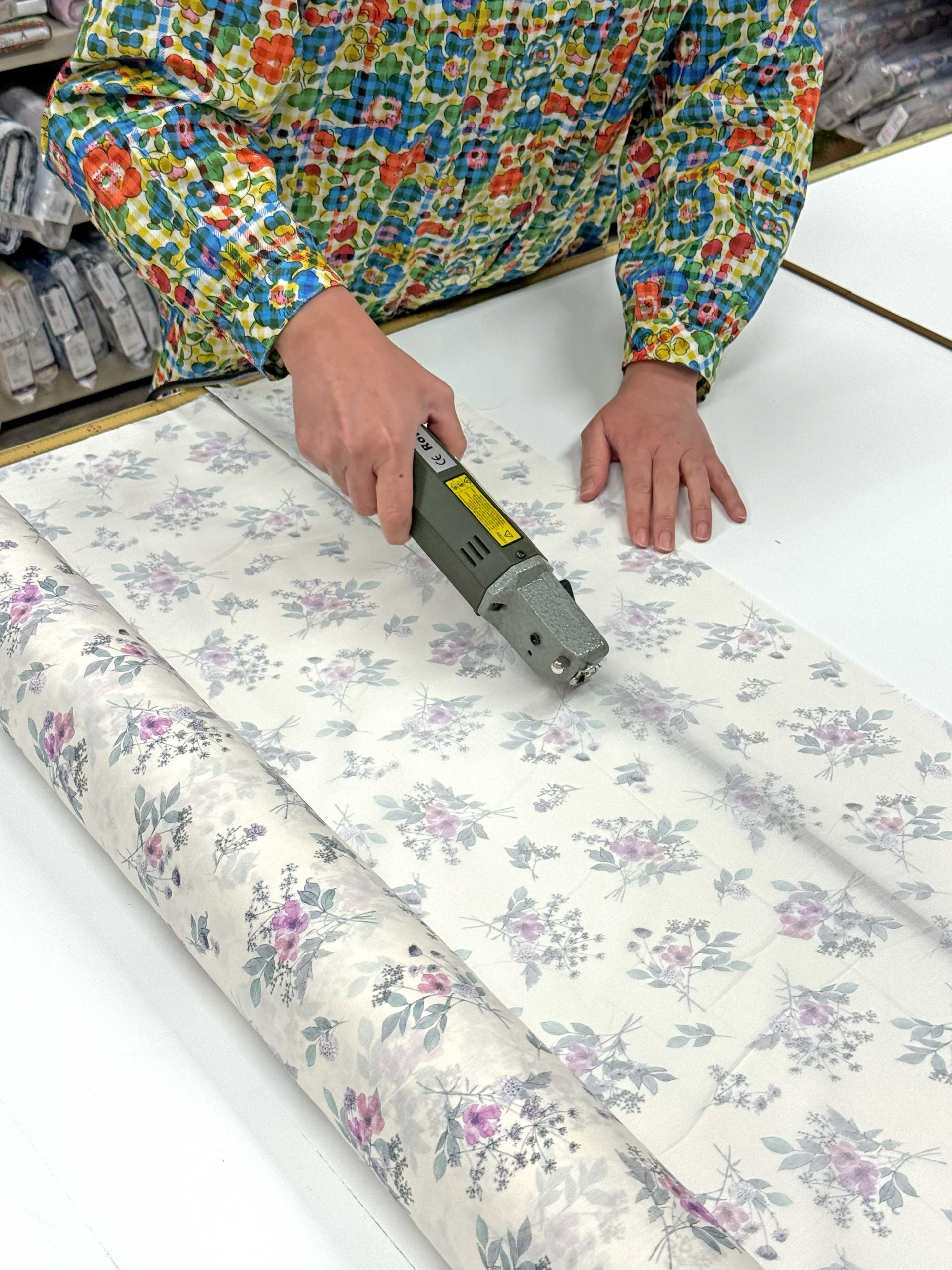 次は、ご注文いただいた数量に合わせて生地をカットしていきます。 リバティ・ファブリックスの大切な生地。柄が歪まないよう、まっすぐ丁寧にカットするのは、実はとても集中力が必要な作業なんです。