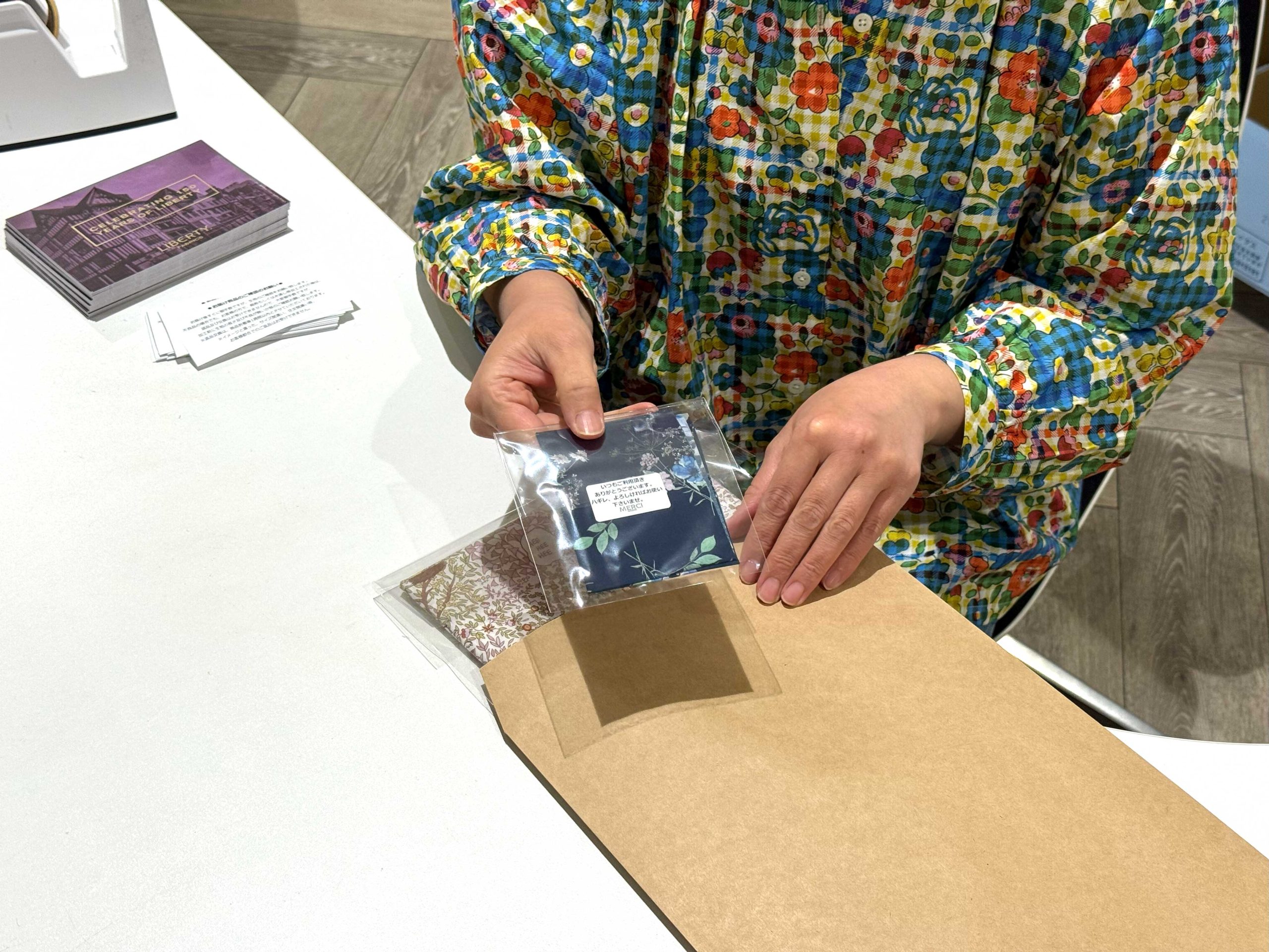 カットが終わったら、検品作業です! 柄や色、数量に間違いがないか、生地の状態は万全か、スタッフが厳しくチェック。 検品をクリアしたら、いよいよ梱包。生地がシワにならないよう、丁寧にお包みします。