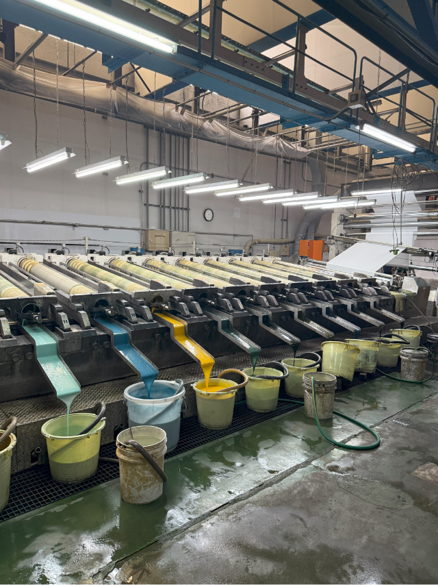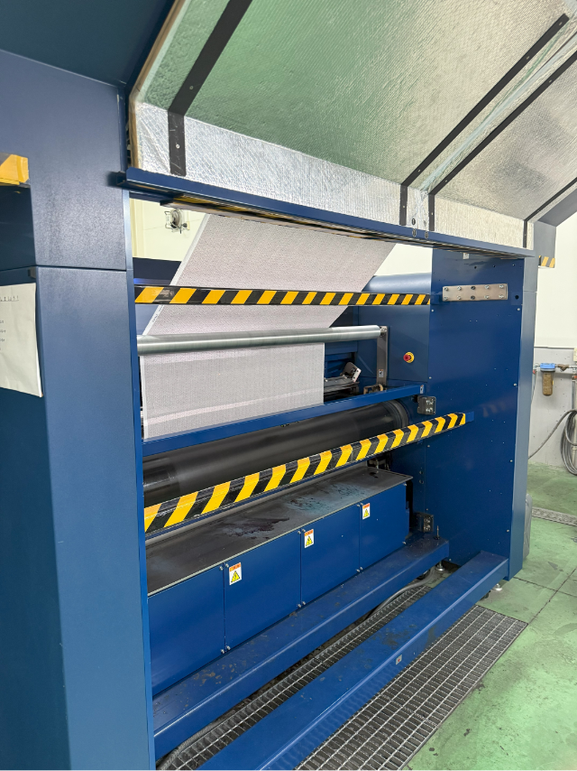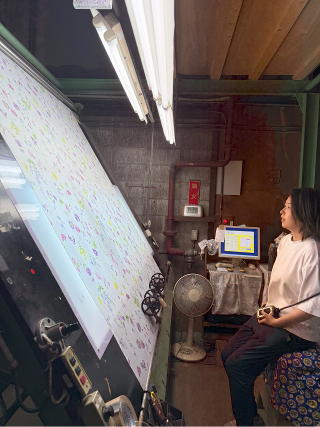 和歌山染工様が国内でいち早く導入されたという量産型の機械から、美しいデザインが寸分違わぬ精度で生地に描かれていく光景は、まさに圧巻の一言でした。
