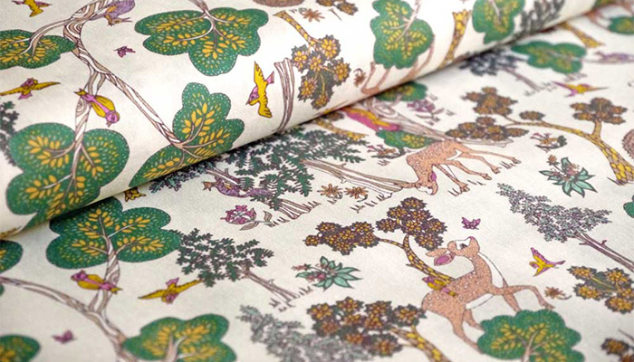 2018春夏柄に描かれた「ドウ・エィ・ディア」。今回のイベントのために4色をメルシーオリジナルカラーで製作していただきました。このデザインはフィオンさんの出身地であるイギリスのウェールズでの思い出の光景が描かれているそう。イギリスの原生の木々の間で戯れる動物たちののどかな光景に大いに影響を受けたそうです。皆さんもフィオンさんの頭の中の思い出を生地から感じていただけたら嬉しいとお話してくださいました。今回はそんな柄からメルシーオリジナルで4色をカラーリングしていただきました。
