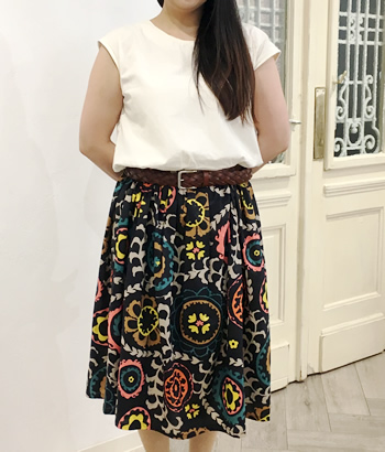 私の選んだスザニ・サークルはオレンジの刺し色と黒地の色彩がエキゾチックでこれからの暑い夏を連想させられます。ローウエストのワンピースを作ったのですが、正直私には柄が派手すぎたので、上部をオフホワイトのリネン生地に切り替えました。すると抵抗がなくなり今ではお気に入りの1着です。定番の柄も良いですが、時には冒険してみるのも良いと思いました。