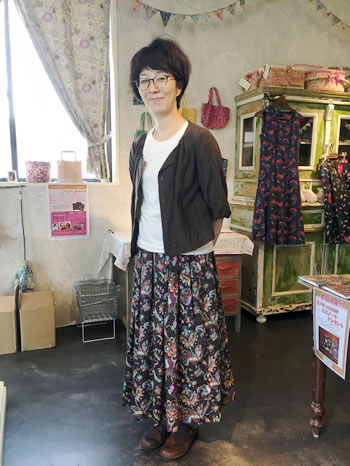 当初、少し派手かなぁと思っていましたが、実際スカートにしてみると大きな柄が映えてとてもいいものになりました。地の色が黒に近いこげ茶なので、白いブラウスや茶系の服と合せています。色違いでC色(白色)も気になっているので、機会があれば作品にしてみたいと思います。