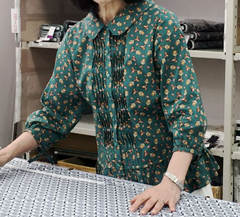 前身ごろにピンタックを入れたくて、小さな花柄を選びました。ウエストからギャザーペプラムを付けてパンツにもスカートにも合うようにしています。前開きにしているのでブラウスやジャケットとして利用できます。年齢を重ねてもリバティの新柄を見ると色々なデザインが浮かんできて作りたいという思いにワクワクします。