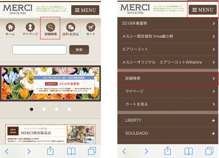 上部メニューの「詳細検索」もしくは右上のメニューから「詳細検索」を選択してください。