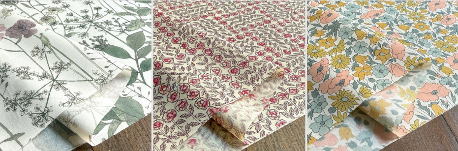 リバティ・ファブリックスは、主に華やかで繊細な小花柄が特徴的です。ファッションアイテムや小物など、身につけるものや日常使いの品に彩りを与えるのに適しており、誰もが親しみやすいデザインとなっております。軽やかな「タナローン」がリバティを代表する生地です。