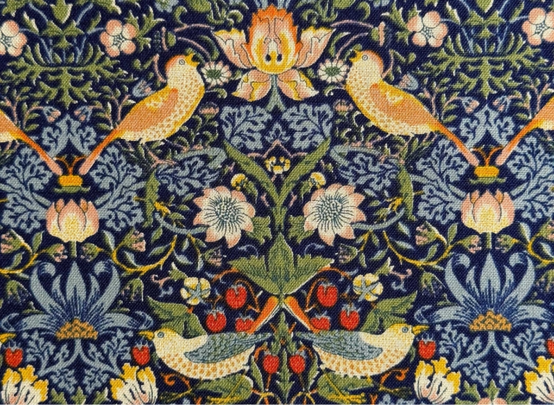 いちご泥棒はモリスの作品の中でも一番有名なデザインのひとつです。オックスフォードーシャー州にあるモリスの別宅ケルムスコット・マナーの庭園にイチゴを盗みにきていたツグミの情景が描かれていて、それがタイトルにもなっています。モリス商会が制作したプリント生地の中で最も高価なもののひとつであったにも関わらず、大変人気のある図案でした。