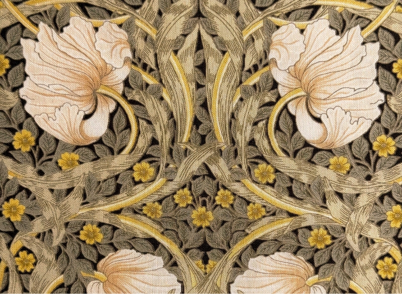 この複雑に入り組んだデザインはチューリップの花の間から覗く小さい花の名前、ピンパーネルから付けられています。ウィリム・モリスが木版の壁紙用にデザインし、自身の別宅ケルムスコット・マナーのダイニング・ルームに使用しました。