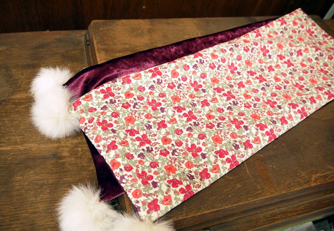表はリバティのコーデュロイ、裏はベロアの高級感に、ファーポンポンのかわいさをプラス♪