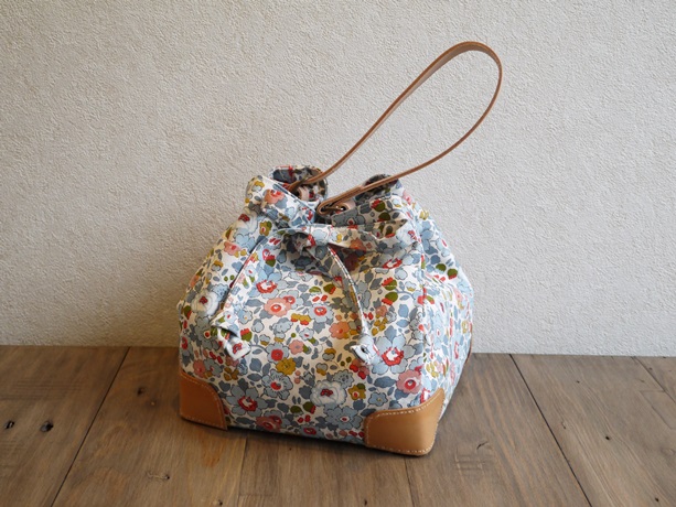 ハトメリングや革底パッチをつけて、ちょっとお洒落にグレードアップ♪リバティ11号帆布で作る巾着ショルダーバッグ。