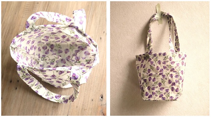 女の子の小さなお弁当箱にぴったりのランチバッグです。お菓子入れにも♪ 【出来上がりサイズ】 巾約11cm×奥行き約11cm×高さ(持ち手除く)約16cm