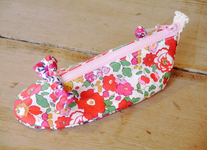 カットクロスのサイズで出来る可愛いシューズ型のポーチ。ファスナーがついているので、ペンケースにもおすすめ。