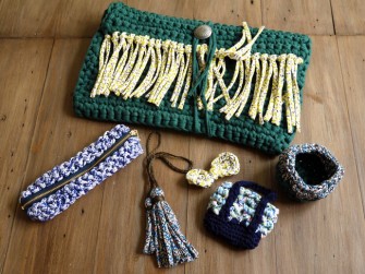 リバティTシャツヤーンを使ったフリンジ付クラッチバッグ